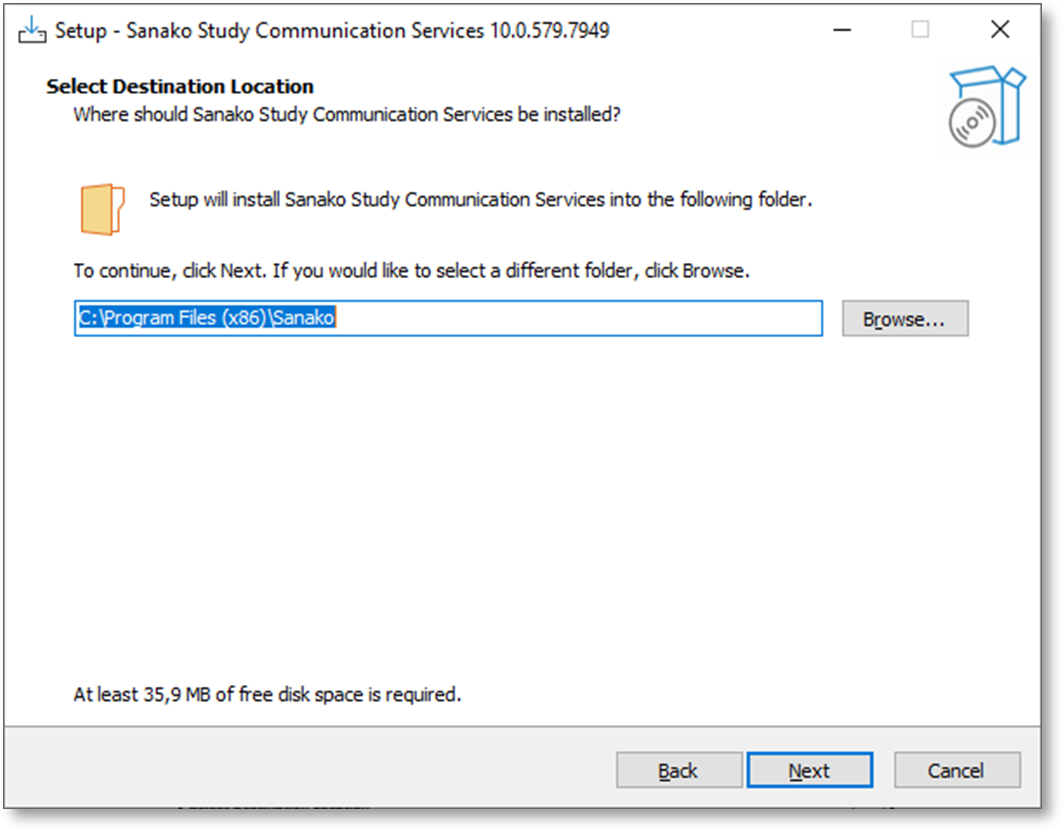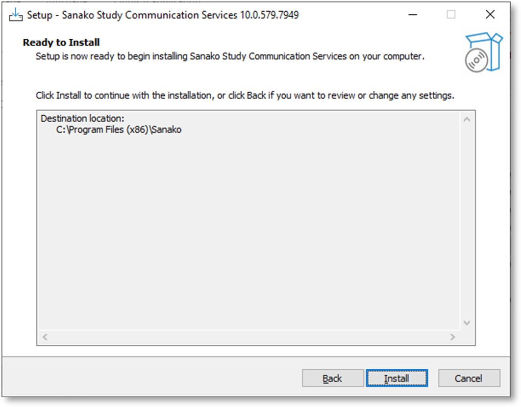 5. Cliquez sur Install pour installer Study Server ou sur Back pour modifier un paramètre.