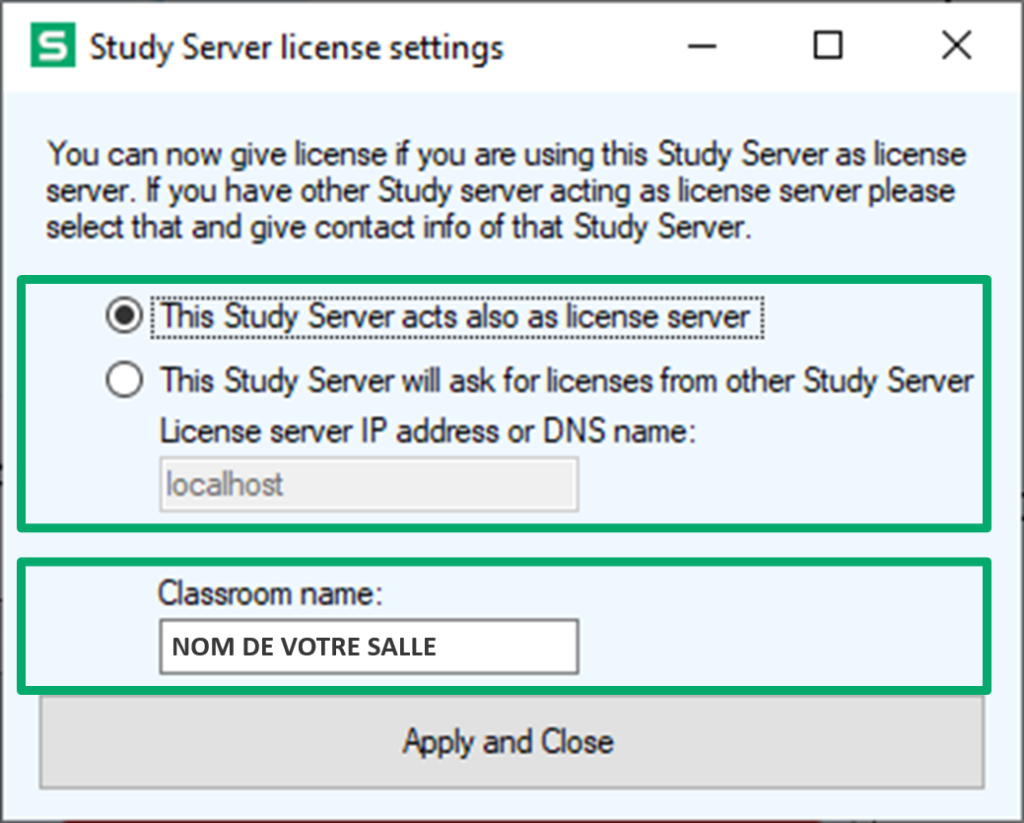 Si vous possédez plusieurs applications Study Server dans votre établissement et que vous utilisez des licences dynamiques, sélectionnez l’option This Study Server will ask for licenses from other Study Server et saisissez le nom de l’ordinateur qui a été sélectionné comme serveur de licences.
