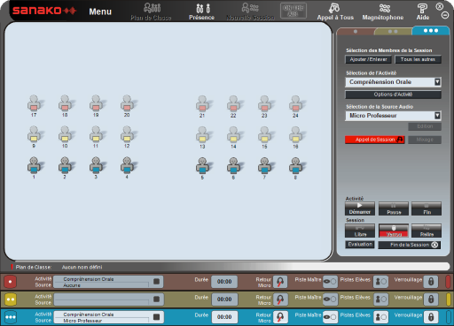 Une session est une situation pédagogique pour laquelle vous sélectionnez des participants et l’activité qu’ils devront effectuer. L’écran des sessions Sanako Lab 100 est la partie de l’interface graphique où vous gérez les sessions. Dans l’écran des sessions, vous sélectionnerez les élèves, une activité et une source audio pour cette session.